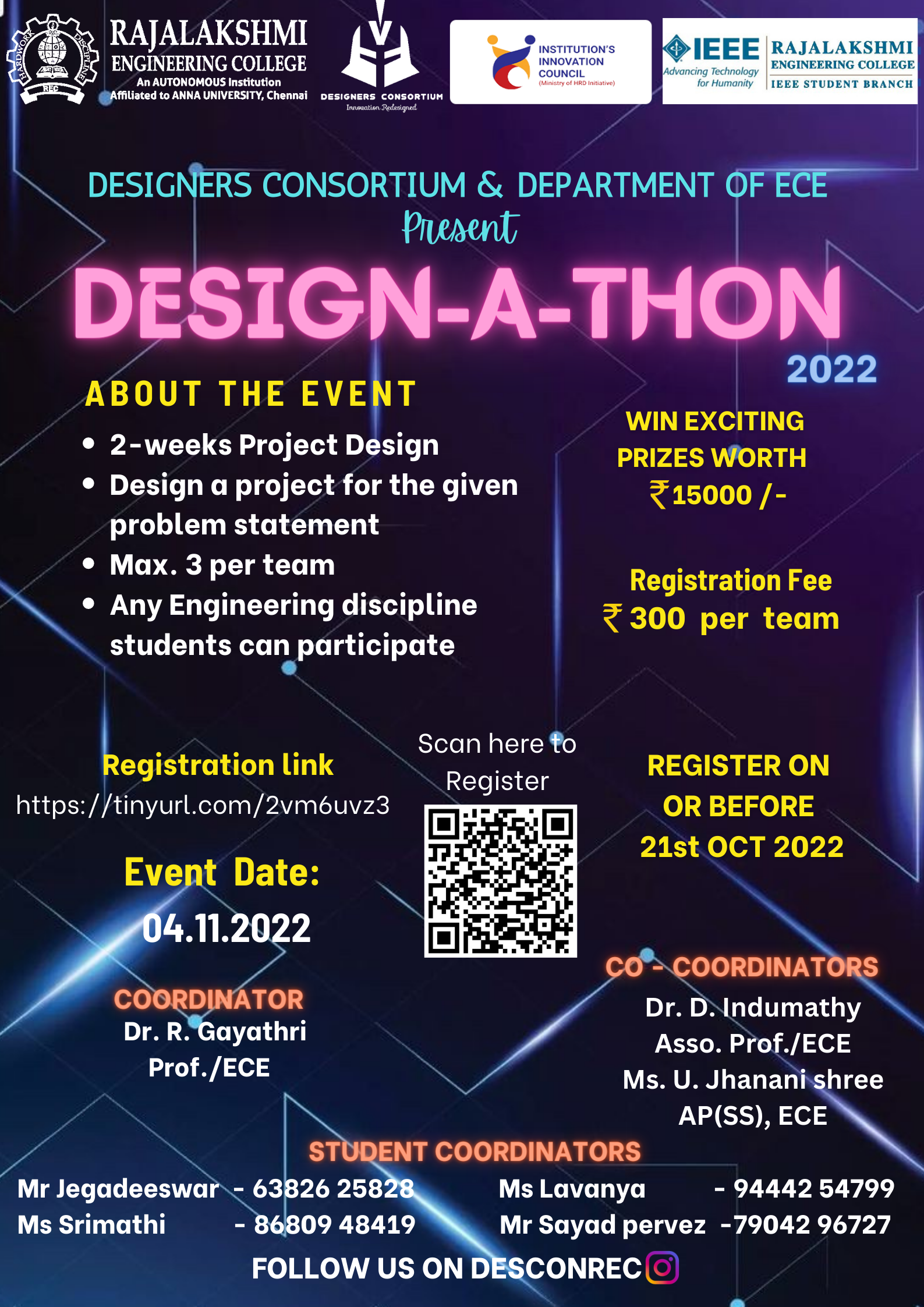 We are a cross-disciplinary club of Rajalakshmi Engineering College created with a vision to bring together ardent students through a series of hackathons, ideathons, workshops, guest lectures and other technical events to showcase their work and knowledge and enhance their industrial skillset We also establish a forum to foster student-faculty interaction outside the world of regular academics.